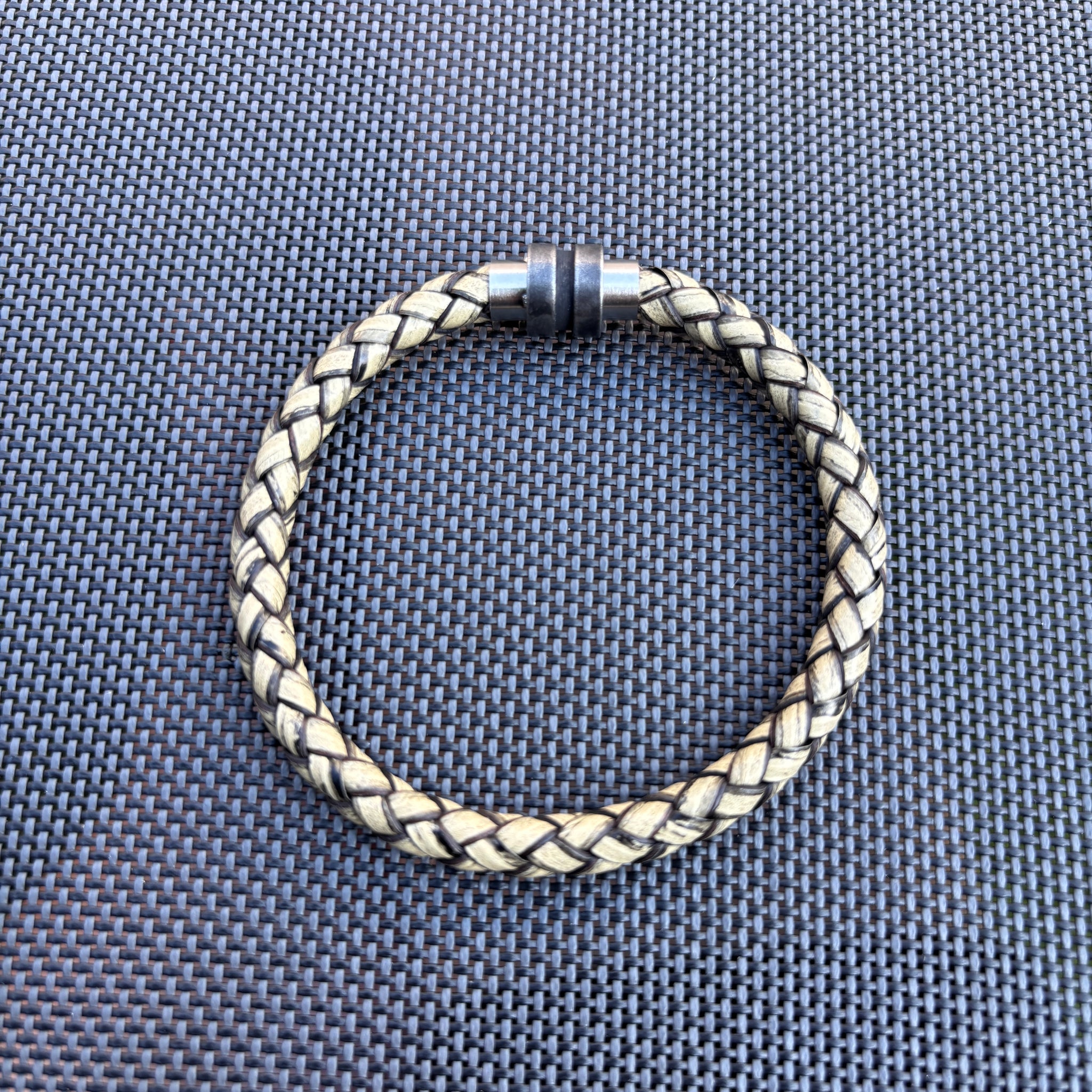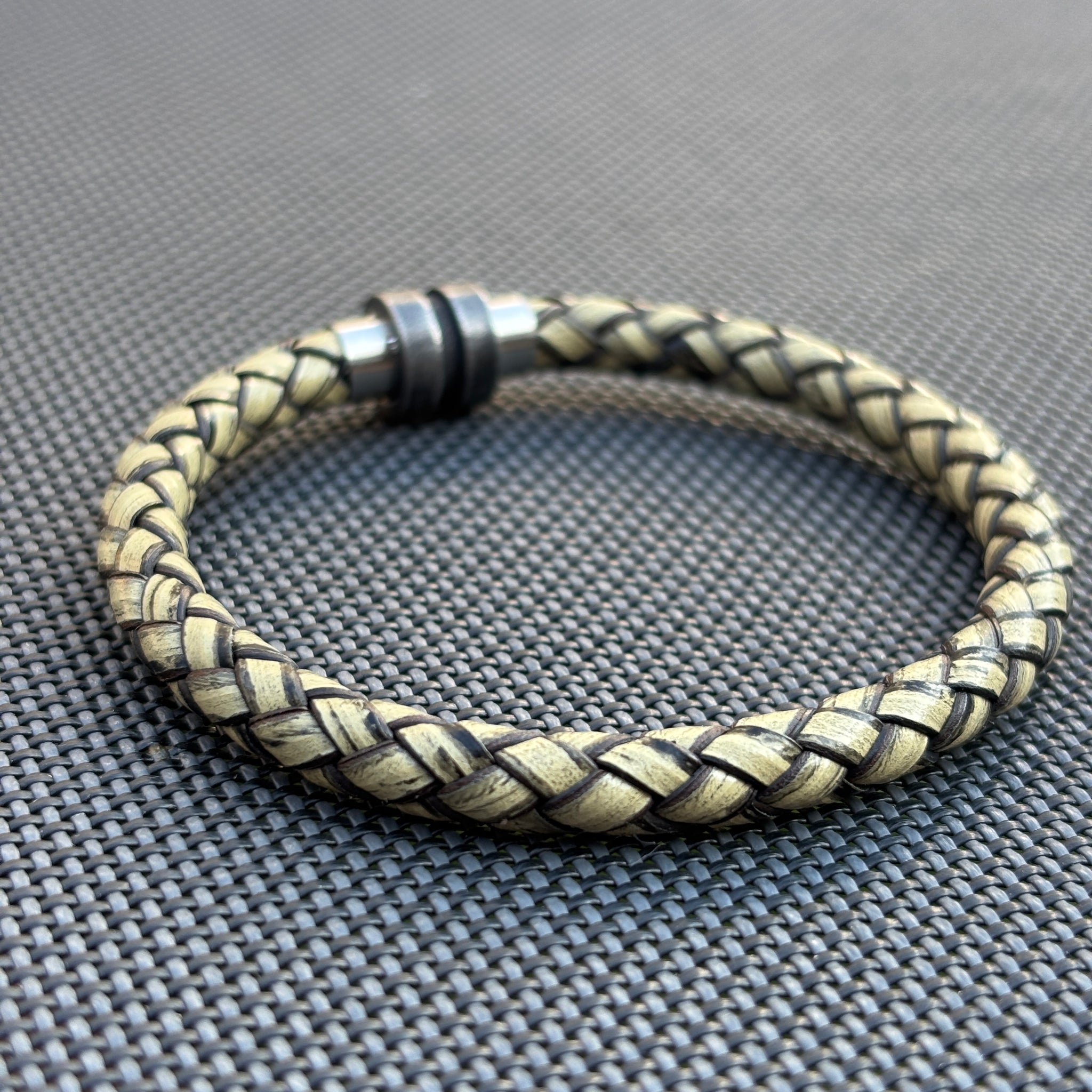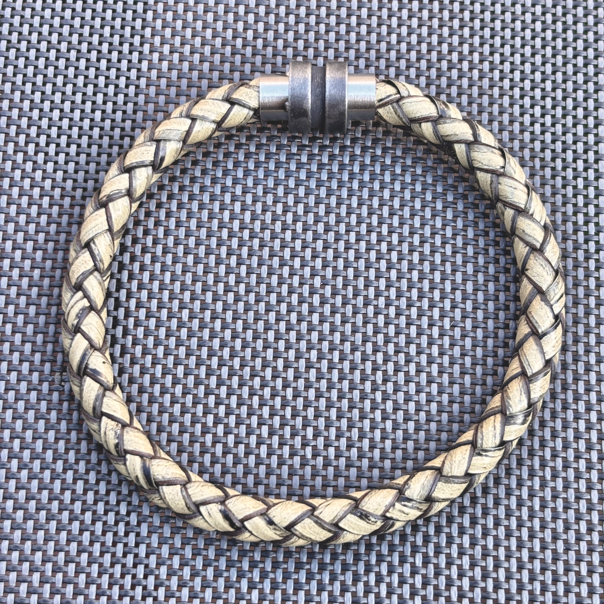 De armband is gemaakt van 6mm geel/creme kleurig leer met een stainless steel (RVS) sluiting. Stainless steel verkleurt niet en gaat lang mee. Zou je de armband in een andere kleur willen of wil je een gepersonaliseerde armband naar jouw wensen? Neem dan contact met ons op.